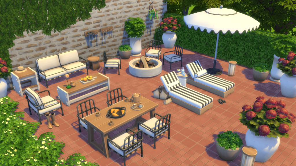 Decora tus patios, jardines y piscinas con un estilo elegante usando los objetos de este pack de CC para Los Sims 4. El set incluye mesas, sillas, sillones, mesas ratoneras, mesas auxiliares, tumbonas, sombrillas, flotadores para el agua, una fogata, y muchos elementos decorativos como plantas, objetos de jardinería, comida decorativa, tazas, platos, copas, linternas, carteras, sombreros ,botas y sandalias.