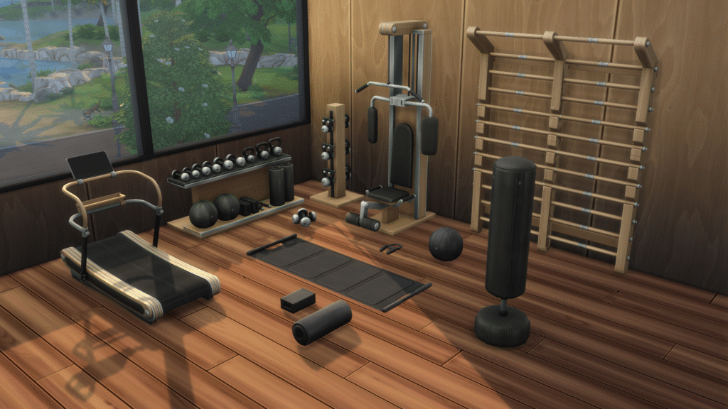 Crea un lujoso gimnasio para tus sims con los objetos y muebles de este pack de CC para Los Sims 4. El set incluye una cinta para caminar, un saco de boxeo, una maquina de pesas, una manta de yoga y algunos elementos decorativos, como cuerdas, mancuernas y variedad de equipamiento de gimnasio.
