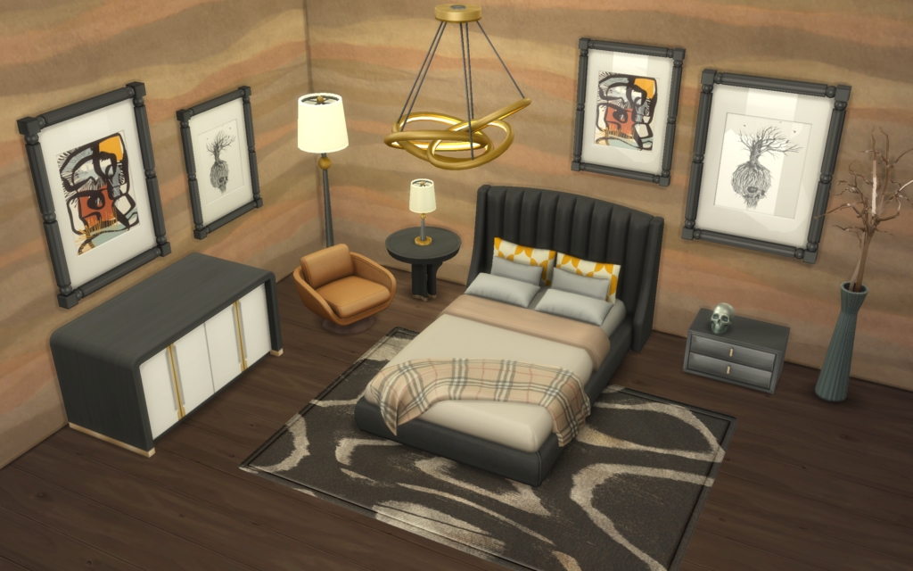 Decora tus dormitorios con un estilo elegante y moderno con los objetos y muebles de este pack de CC para Los Sims 4. El set incluye una cama doble, mesas de noche, una cajonera, un sillón individual, lamparas de pie, de mesa y de techo, y algunos elementos decorativos como una alfombra, un para de cuadros o una escultura de una calavera.