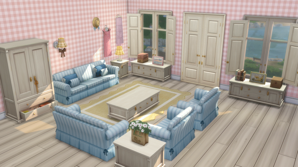 Decora tus livings con un estilo tierno y adorable con este pack de CC para Los Sims 4. El set incluye un nuevo conjunto de sillones con cojines, mesas ratonas y auxiliares, armarios, lámparas de mesa y de pared, puertas, ventanas, y algunos elementos decorativos como sombreros y vestidos para colgar de la pared, libros, cajas, cuadros, una bolsa con margaritas y una alfombra.
